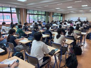 トフルゼミナールより講師の方をお招きして、TOEFL iBTの勉強法と戦略についてお話を伺いました。この講座は毎年春と秋に開催していて、今年は80名の生徒が参加しました。本校生徒の英語学習への高い意欲がうかがえます。この講座では、TOEFL–iBTで既に 80点以上を取得している生徒が100点以上を目指すために必要なことや、長文読解に必要不可欠なポイントなどについて、具体的に解説していただきました。また、第二外国語についてもC1(CEFR)を目指して学習しておくことで、海外大学進学の可能性もさらに広がるといったアドバイスもありました。今後もぜひ積極的に参加してみてください。