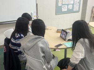 本校の生徒は9名が参加し、冒頭では両校の生徒が3つのグループに分かれ、自己紹介や自由な対話を通して打ち解けていました。話題は「学校生活」や「異文化の中での挑戦や発見」、「留学への関心」など多岐にわたり、日本語、韓国語、英語を交えながら交流を深めました。