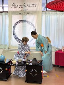 留学生向けの特別プログラムとしては、日本語授業や一休寺へのフィールドワーク、父母の会茶道部による茶道体験に参加しました。一休寺で歴史に触れお茶やお茶菓子に感激していた留学生たちは、この茶道体験に高い関心を持って参加していました。日本茶の飲み比べでは、楽しく盛り上がると同時にお茶の奥深さに感動していました。また化学、体育(タッチラグビー)、英語コミュニケーション、書道などの通常授業にも参加し、日本文化を、そして本校の生徒と共に日本の学校生活を体験しました。